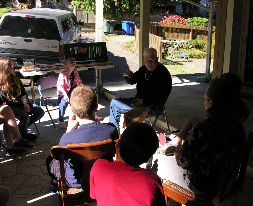 2014 Bellevue Home School Demo Report On October 6th 2014, PSK members Jim Keffer and Barry Bonnell we're invited to give a demonstration and lecture on flintknapping to a dozen 'Home Schoolers' as part of their Paleo-History studies. This demo/lecture was scheduled just three days after the Open Windows School Demo and I didn't even unload my truck! In fact, after working with Joe 'Doc' Higgins and several other PSK members to demonstrate flintknapping at various schools I've come up with a checklist that will become part of the Events section. As with private schools the students in the 'Home School' class were enthusiastic and highly motivated! We started out with a discussion on safety demonstrating the extreme sharpness of obsidian and other knappable rock. Then everyone donned a pair of safety glasses! Next we looked at flintknapping tools - some traditional (Abo), hammerstone, antler billets, antler tines and bone punches/flakers, and some modern (copper boppers, pressure flakers and Ishi stick. Following the tools the students were treated to displays of some of the best the PSK has to offer - points by Steve Allely, Joe Higgins, Dave Rauschenberg, Jim Miller, Jim Hopper, Grady Bowen, Harry Oda - just to name a few! Then we moved on to look (and touch) at a variety of knappable rock- everything from obsidian of various colors to Flintridge flint to Scandinavian flint and much more. After looking at tools and rock we moved to a demo. The basics of percussion knapping were discussion and demonstrated with the end result a pretty decent 4" bi-face from Midnight Lace Obsidian. Finally everyone that wanted to, and that was most of the students and some of the parents, got to do a little hands-on work. Just about every student that tried to make a point eventually ended up with one And is spite of being a 'PSK Noobie', Barry jumped right in and was more than up to the task of passing along what he'd learned from PSK members over the last few months. Barry will be - no Barry is, an outstanding addition to our group - a born teacher! Here some of the photos taken by none other than PSK member Barry Bonnell! |