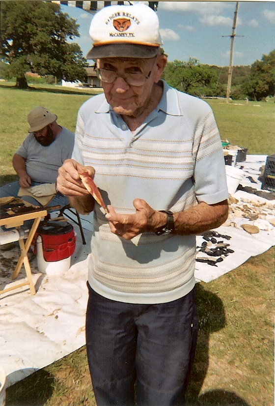 The Last Swoose Point John Alexander aka 'Swoose" was a remarkable flintknapper - especially to those that knew him and his work. Although best known for his 'forked stick fluting technique' perhaps his most famous creation was the curved 'Swoose Point'. In April of 2005, PSK members Joe Higgins, Jim Smith and Tom Sterling made a 2,192.4 mile road trip to attend what was to be Bill Metcalf's last Fredricksburg Knap-in. While there, they were luck enough to meet and knap with both Bill and 'Swoose'. And here's probably the last curved point Swoose ever made - photographed by PSK member Jim Smith at Bill Metcalf's last Fredericksburg Knap-in, April 2005, just seven months before his passing, According to Jim Smith , Swoose said it would be the last curved point he'd ever make. This point sold as part of a charity auction for around $400 - a heck of a deal! John Alexander aka 'Swoose' passed away January 4th, 2008. To learn more about this remarkable flintknapper visit Ray Harwood's Blog, specifically http://flintknappingdigest.blogspot.com/2010/12/swoose.html