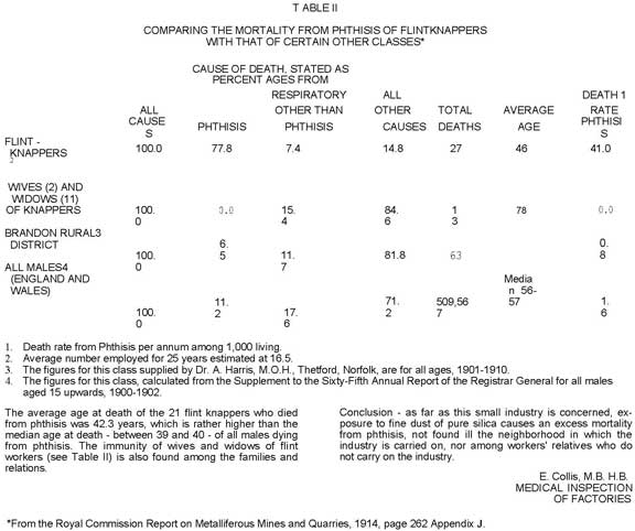 Flintknappers' Exchange 4(2): 1981 There is a direct relationship between the silica content of and industrial dust and workers' deaths from pulmonary tuberculosis. The 1913 study by Dr. E. Collis showed that over three quarters of the flintknappers at Brandon, England died of this problem. He was able to show that workers with silicosis are more prone to contracting tuberculosis and more susceptible to infections from other types of pathogens. Even relatively harmless dusts, when inhaled by a person with mild silicosis, may create a potentially serious pneumonoconiosis condition (Collis 1913). His research concluded that the more different a substance is from those of which the body is naturally composed, the more injurious it is to the body. In light of this information, how can we flintknappers protect ourselves from these dangers? THE DANGERS OF WORKING INDOORS: In 1930, Middleton measured the atmospheric dust produced by two flintknappers working in a shed. His findings showed concentrations as high as 1,313 particles per cubic centimeter, with the majority of the flakes under 1 micron in size. Only 2% of these tiny flakes were over 2 microns. These minute particles easily enter the 20 micron alveolar sacs of the lungs, making silicosis complications from flintknapping understandable. Remembering that a micron is only one thousandth of a millimeter helps you visualize how small these flakes actually are. By definition, particles smaller than 1 micron cease to be called dust and are classified as fumes and those smaller than .3 of a micron are listed as smoke. Imagine the particle counts at a modern indoor knap-in. Errett Callal1an spoke of seeing clouds of dust at the Flintknappers' Exchange 1979 Knap-in at Casper, Wyoming (E. Callahan 1980). During the winter I maintain an indoor workshop in the basement of my house. Since the ventilation is poor, 'I now wear a respirator while working. The Mine Safety Appliances Company in Pittsburg, Pennsylvania makes a mask for dust and fumes that does the job, It is a COMFO 2, custom respirator with a filter cartridge for asbestos-containing dusts, fumes, and mists. While no filter gets everything, the filter meets Mine Safety and Health Administration (MSHA) and National Institute for Occupational Safety and Health (NIOSH) safety requirements. A mask with dual filter cartridges should cost about $20. The cartridges may be' used until they become clogged with dust before changing, but care must be taken not to let the interior of the mask become contaminated with silica dust when it is not being used. To prevent this, I fasten plastic sandwich bags around the cartridges with rubber bands. Be sure to wear your mask while sweeping up debitage. When working indoors, remember it takes over a half an hour for suspended silica dust and fumes to settle (Middleton 1930). An exhaust fan will also prove useful when working indoors. Clothes worn while knapping should be changed, or at least brushed off, after working to avoid tracking dust into living and sleeping areas. Another possibility would be some type of knapping apron to protect clothing from dust. Use of a particle ionizer will also reduce exposure to small particles (electrostatic precipitator). WORKING OUTDOORS: Unless a wind is present, I try to wear a mask while working outdoors, especially when the work is very dusty. When working without a mask, I try to sit so that the wind aids in dust removal. I also try consciously to time my breathing to avoid inhaling the clouds of dust I have just produced, whether from quarrying the stone or finishing a biface with pressure. Fine dust forms whenever the stone is broken. For example, I have found that my platform preparation technique of shearing/abrading tends to produce a lot of visible dust. This can easily be seen when viewed by a strong side light against a dark background. You will notice that while the tiny flakes fall to the ground, a smoke-like powder floats upward, where it is easily inhaled/ Because of this, when I work without a mask, I try to avoid inhaling whenever I see dust while abrading. I hold my breath or slowly exhale, blowing a fine stream of air across my platform. This helps to get the dust away from me so it can be dispersed and removed by air currents. Incidentally, most of the disposable dust masks for sale in hardware and paint stores provide only limited protection and arc inadequate for filtering the suspended silica dust and fumes produced by knapping. HISTORIC: Silicosis is the oldest ~known occupational lung disease (Berkow 1977). Historically, the use of dust masks for flintknapping begins in Brandon, England, where gun-flint knappers wore sponges tied under their noses in an effort to prevent the devastating effects of Phthisis or "knappers rot" (Shepherd 1972). Historically the flintknappers of Brandon, England, still a knapping center, suffered a high mortality rate from silicosis, often with tubercular complications (Collis 1913, 1915). Working mostly in sheds, skilled knappers, who could make three thousand gun flints a day (Webb 1911), were not expected to live much more than forty years (Collis 1913 and 1915; Middleton 1930; Shepherd 1972). The Table (Table II) by Edgar Collis, Medical Inspector for Factories in England, shows the death rate for Brandon Flintknappers. We are most indebted to him for his research. Notice that wives of flintknappers and others not engaged in the profession were not affected by silicosis and had normal life spans. Agrecola (1557) noted that wives of Carpathian miners had as many as seven husbands, due to the high mortality rate among the miners from silicosis. In the "Minutes of Evidence", Collis describes in detail several of the flintknapping families. At the time the study was made, in one family of twenty-six persons (thirteen males and thirteen females), twelve of the males had been flintknappers and ten of them had died. This left two flintknappers and the one 'non-flintkn