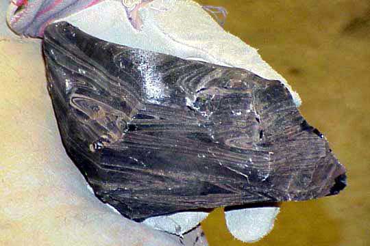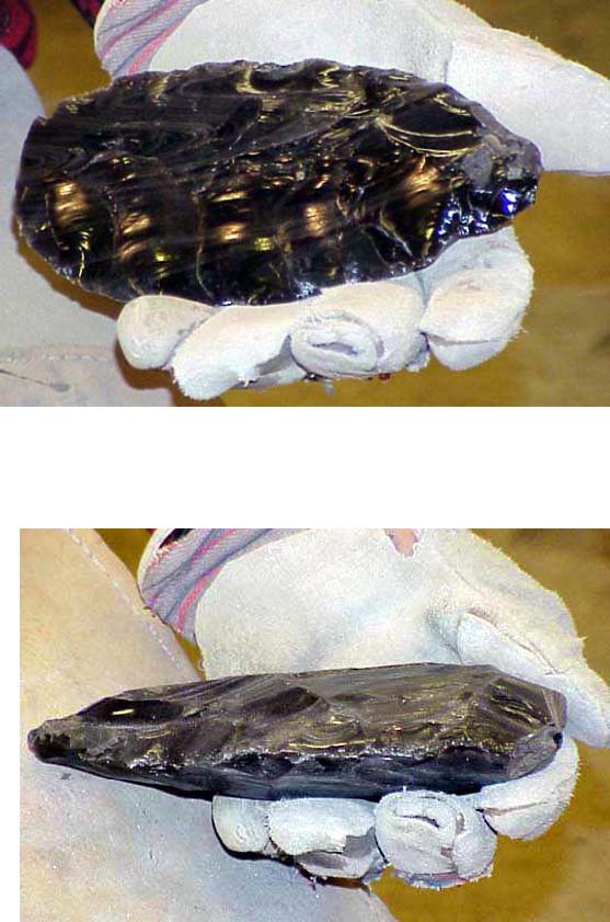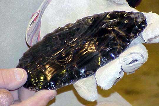 Note the heavy leather glove on his left hand, and the thick leather pad on his leg. The flakes he'll be removing are said to be the sharpest edge known to man. Because of the conchoidal breakage characteristics of obsidian, the edge produced is feathered out to an edge one molecule thick, far sharper than the best surgical steel.