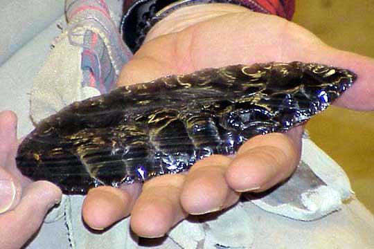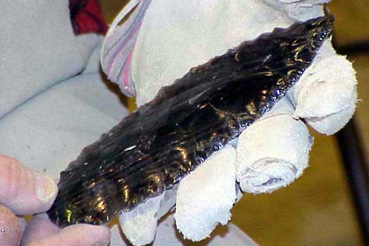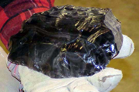 Here's the actual theory put into action. Doc Higgins is holding a piece of "Silver Sheen" obsidian (named because of the gray layers in it) that he's going to turn into a seven inch blade. This is a large, angular and knobby piece of obsidian, a naturally occuring volcanic glass. Native Americans favored this material for stone tools, using it whenever they could obtain it.