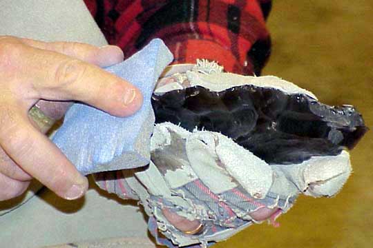 You probably noticed the buffalo hide leg pad in the above photos. This hint will work with any leather pad but the buffalo hide seems more supple and thicker, and more perfectly suited to this next tip.