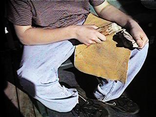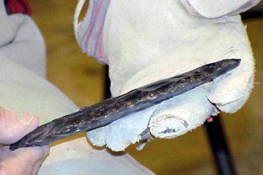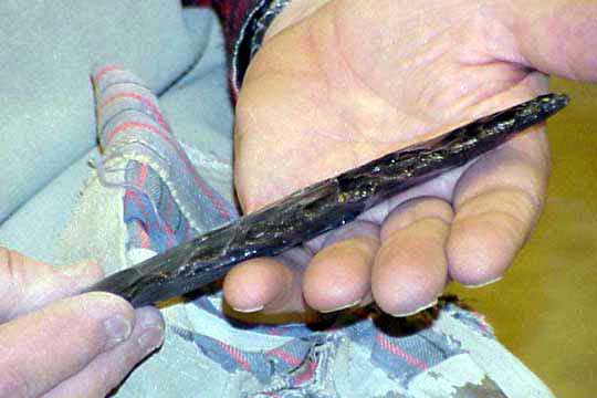 Here Doc's about to take the first in a long series of flakes from the obsidian. He's using a solid copper bopper here, and will be hitting about one third of the way up from the bottom of the edge nearest the bopper. The flake will detach from the underside of the stone. By controlling where he hits the stone, the angle he holds it, the angle he strikes it at, and the force of the blow he will gradually remove unwanted portions, resulting in a beautifully flaked blade with matching flake scars. He's been doing this since about 1990, and is self taught. I've (Tom) been doing this for about two years, and can produce blades only half the size Doc can, and not nearly as pretty. I also break quite a few. For me, a tragic case of theory wildly outstripping performance. While anyone can learn to knap successfully, truly beautiful work requires lots of practice and extreme dedication.