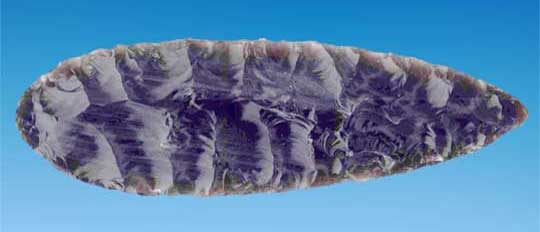 The finished 7 inch blade. Note the evenly spaced flake scars, matching with other scars from the opposite side, and smooth edges. A beautifully knapped knife blade, or with several knotches at the wide end, hafted onto a spear. All told, several hours of intense concentration, and lots of years of practice in the school of hard knocks, cuts, scrapes and jabs.