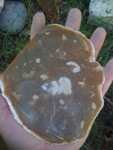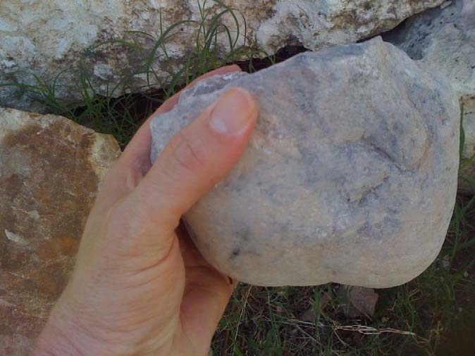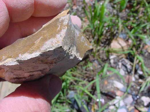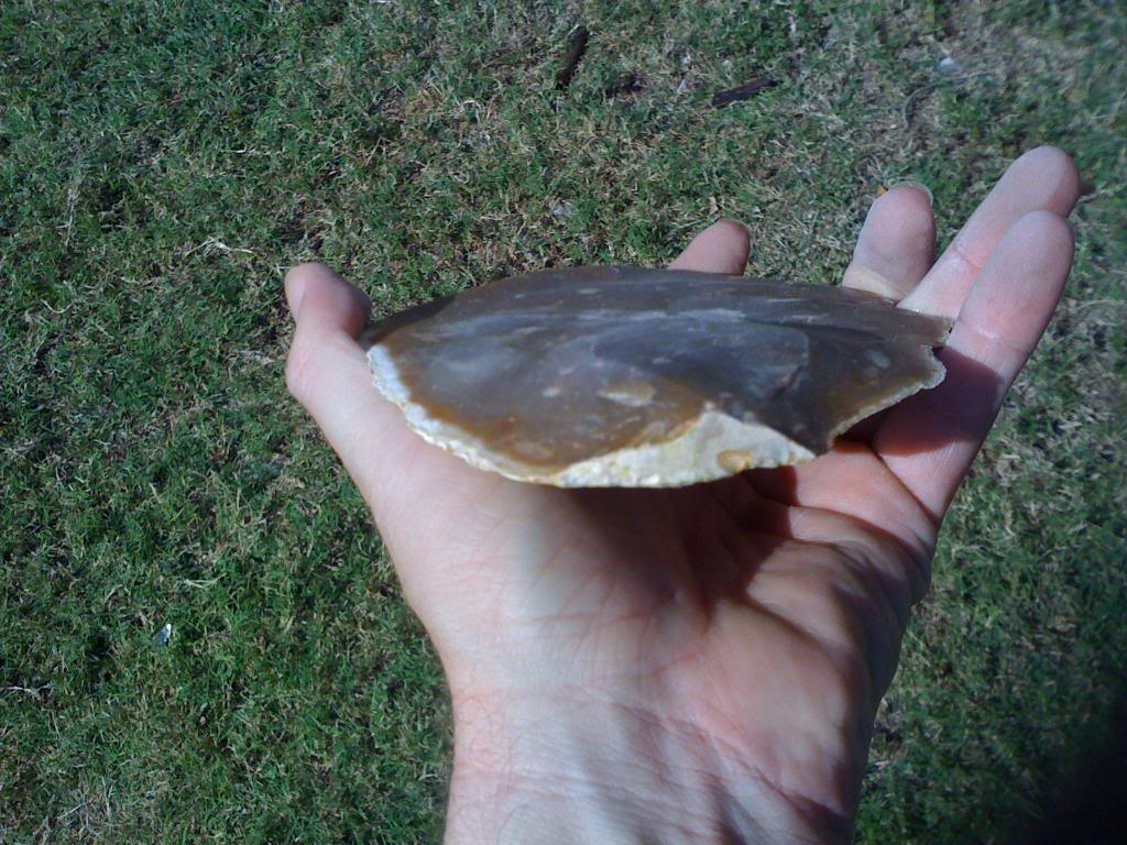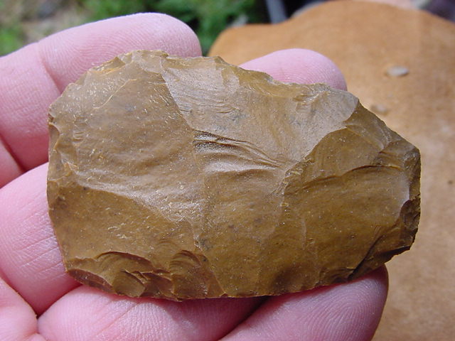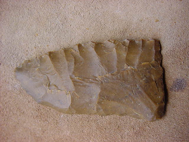 Here's the rock several series of flakes later, at a stage called a "biface." This is the stage at which Native Americans would have used to transport the stone for trading or taking home. Rather than carrying a lot of waste stone (remember, no pickup trucks back then), Native Americans would have reduced the raw stone to this stage, and carried them away in baskets. From this stage, a large knife blade or spear point could be produced at will, and most of the subsequent waste flakes taken off would be recycled as small cutting tools or arrow points.