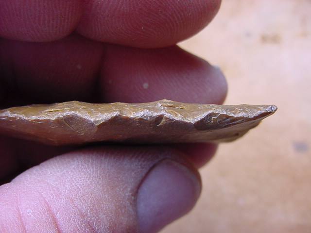 Side view of resultant flake, notice it's flatness which is what you want on primary thinning flakes initiated from either the proximal or distal (point) end.