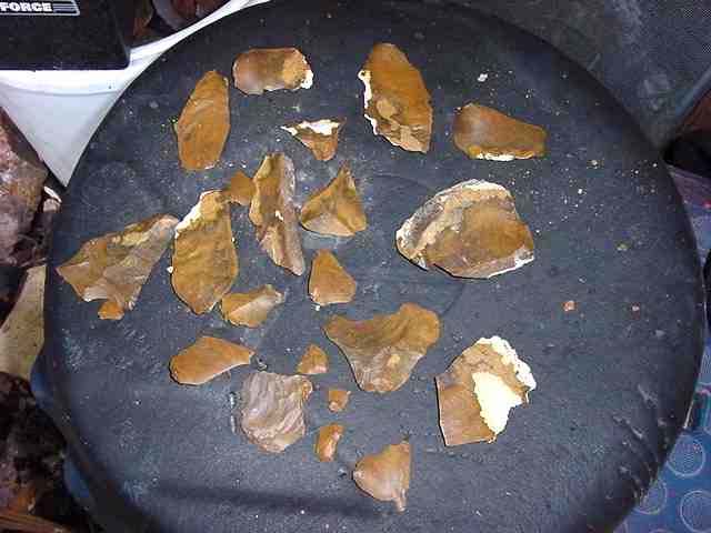 Here's the "debitage" (waste stone) pile left after finishing the blade. Many of these flakes are useable as cutting tools simply by abrading the side held next to the hand (for safety), or to be made into smaller knives, arrow points, drills, scrapers or other tools. This is also the amount of material a Native American trader would not have had to carry when he (or she) took out only biface stage material.