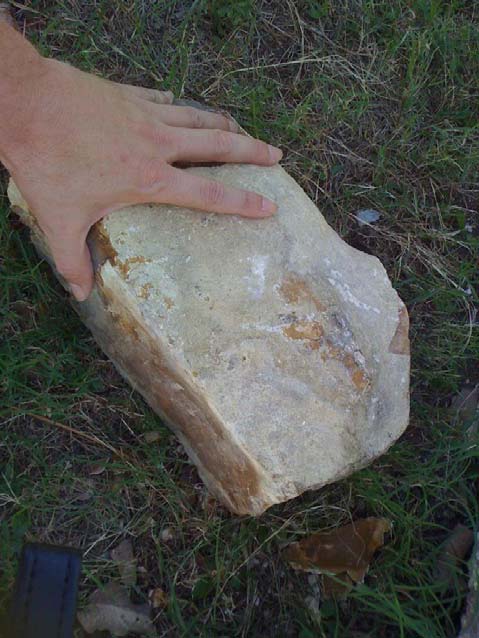 Large nodules are cumbersome to hold in one's lap. If they rest directly upon the ground, they can be very hard to spall. By creating a tripod, the large nodule can be elevated, and the back side of the nodule held down with a foot, while a really heavy hammerstone is used at a low speed to detach large flakes. Here is the nodule.