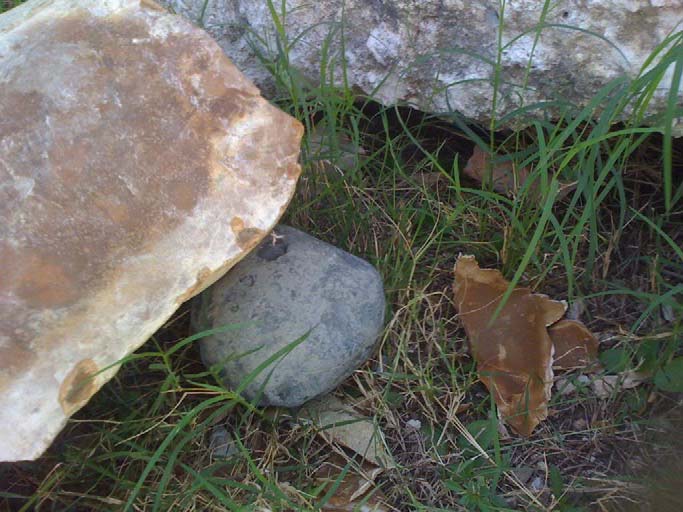 Here is the nodule in a tripod. (I am holding a flake in place by hand): Here is another shot of the other end, with the support stone underneath:
