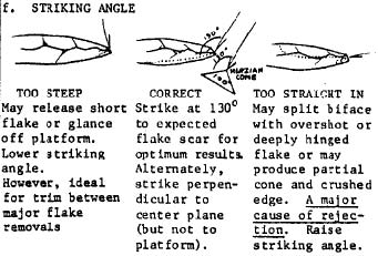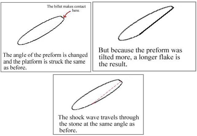 After much practice you have probably standardized your billet swing so that it is coming down at pretty much the same angle all the time. This swing has become natural to you. You are hitting your platforms pretty much the same every time. Since this swing has become a constant, we have an opportunity to have some control over the thinning process and the length of the flakes we take off.