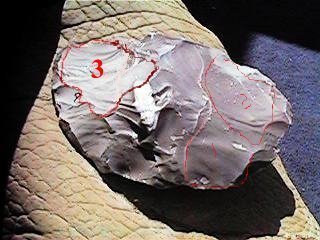 The first one is a pic of the flake I intend to take. My finger is on the platform I'm going to use and it points in the direction of the indirect blow. Notice the spur I left on the opposite face? That is something I do when I plan on getting an overshot. Or in case I get a shorter undesired flake I can remove the remnants from the opposite direction. The spur allows for correct contours and edge thickness and allows the flake a place to dive (when