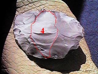 And now flake 4, the middle, is taken off. Because the middle had such a nice ridge, the flake flew clear across the piece--six inches. This preform is six inches wide and seven and a half inches long. but it has already become quite flat on this side with just a few hits because the techniques we have learned here were followed.